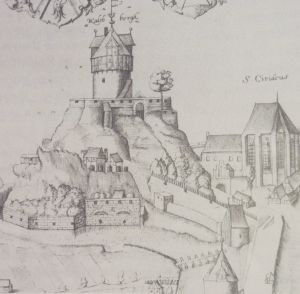 Hermann Billung baute in der Mitte des 10. Jahrhunderts auf dem Kalkberg eine Burg,<ref>Karl Kayser: ''Chronik des im Hannoverschen Amte Medingen belegenen Kirchspiels Wichmannsburg'', Meyer, Hannover (1878), Seite 16</ref> welche bis Februar 1371 stand. Von ihr aus wurde das Fürstentum Lüneburg-Braunschweig regiert. Im Rahmen des [[Lüneburger Erbfolgekrieg]]s wurde die landesherrliche Burg auf dem Kalkberg ebenso zerstört wie das nahe [[St. Michaelis|Benediktinerkloster St. Michael]], das daraufhin in die Stadt umzog. | [[Datei:Kalkberg historisch.jpg|mini|Kalkberg von Süden, Zeichung von Daniel Frese (ca. 1610)]] | ||