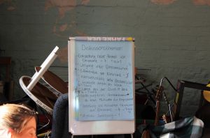 Außerdem wurde ein Tauschhandel von Fähigkeiten, das Teilen von Gegenständen und stärkere Vernetzung als Möglichkeiten angesprochen, Geld zu sparen. Dies könnte auch nachbarschaftlich oder in Form von Wohnprojekten möglich sein. Auch eine Patenschaft von Menschen mit Zeit zum Ehrenamt, aber wenig Geld zusammen mit Menschen, die genug Geld, aber keine Zeit haben, wäre möglich. Dies alles sind Ansätze, die durch Selbstorganisation Ehrenamt ermöglichen können, ohne auf Änderungen “von oben” angewiesen zu sein.