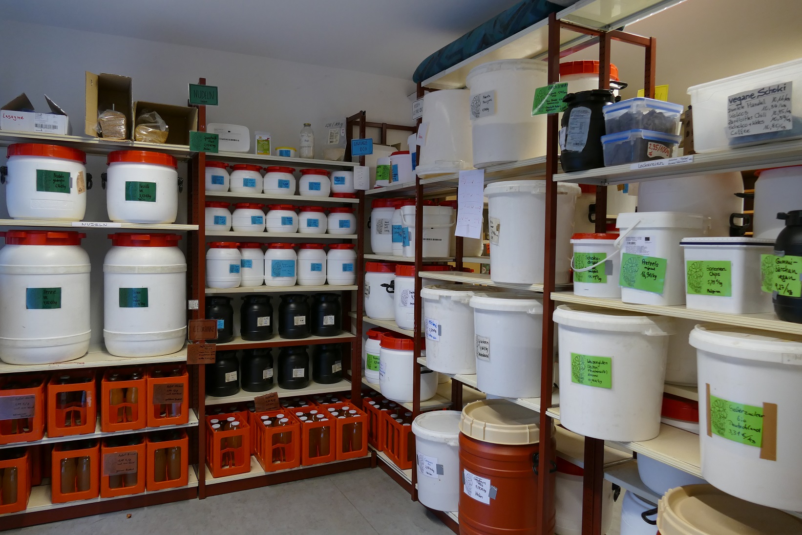 Lebensmittelkooperative Kornkonnection Lüneburg. Gefüllte Regale mit mottendichten Behältern.