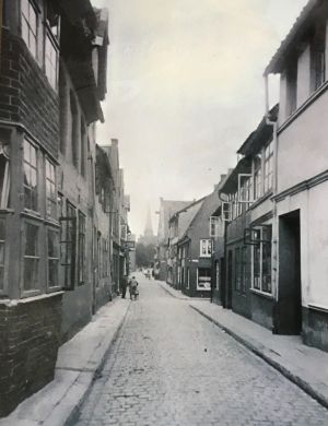 Die Straße "Auf dem Meere" war schon während der Fürstenzeit Teil des Lüneburger Stadtkerns. Neben der "Salzbrückerstraße" und "Altstadt" war sie eine der drei Hauptstraßen des westlichen Stadtteils und führte direkt zum Kalkberg. [1] Im Mittelalter haben in der Straße "Auf dem Meere" vor allem Maler, Bildschnitzer und Goldschmiede gewohnt und ihre Werkstätten betrieben. [2] Das Kopfsteinpflaster, das heute typisch für die Lüneburger Altstadt ist, war zwischenzeitlich von Asphalt bedeckt und mit einem Bürgersteig versehen. Heute ist die Straße durch das wieder freigelegte klassische Kopfsteinpflaster und die historischen Gebäude ein beliebtes Fotomotiv und Teil vieler touristischer Stadtführungen.