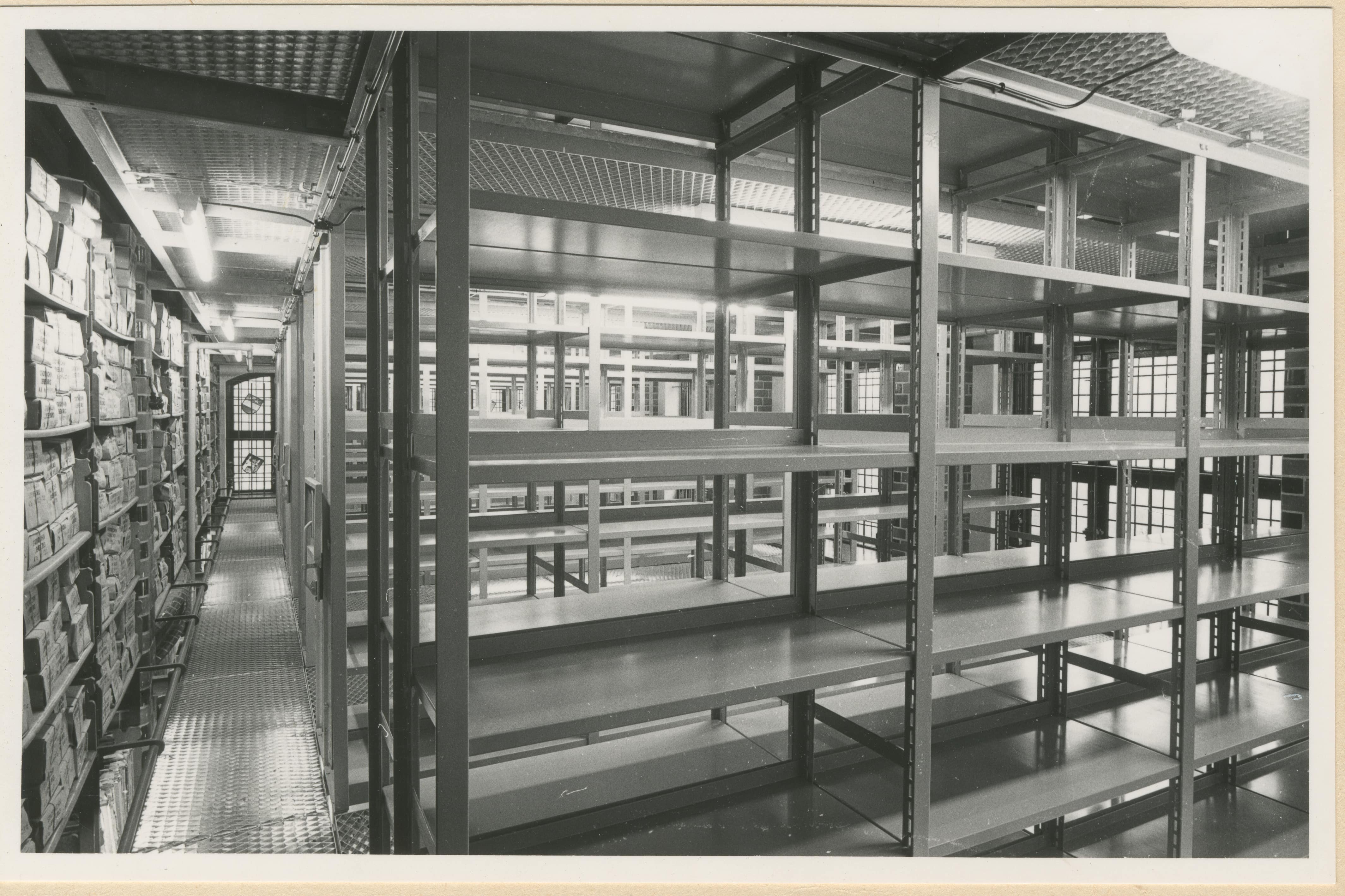 Magazinraum des Stadtarchivs im Rathaus nach dem Umbau mit neuer Stahl-Regal-Konstruktion, hier die oberste Etage, 1960 (Quelle: Stadtarchiv Lüneburg)