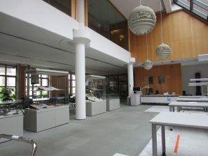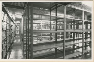 Magazinraum des Stadtarchivs im Rathaus nach dem Umbau mit neuer Stahl-Regal-Konstruktion, 1960[1]